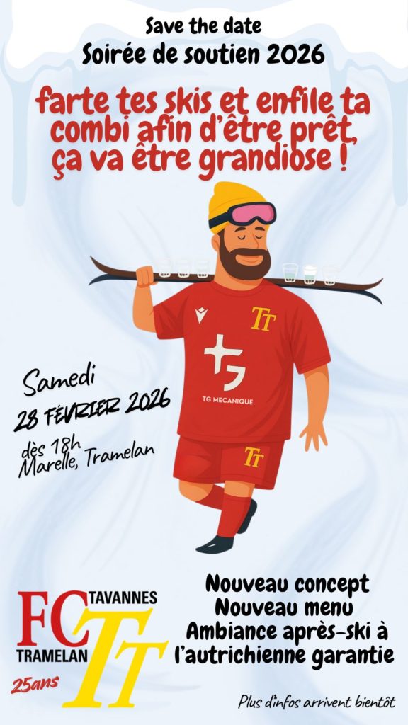 Membres et sympathisants du FCTT, retenez bien cette date: le samedi 28 février 2026. C’est ce soir-là qu’aura lieu notre traditionnel repas de soutien à la Marelle, à Tramelan. Comme le montre l’image ci-dessus, les organisateurs viennent de lancer leur premier teasing. De nombreuses nouveautés viendront agrémenter la manifestation, sur lesquelles nous reviendrons bien sûr en temps voulu.